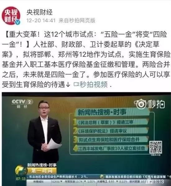 01、重磅!五險(xiǎn)將變?yōu)樗碾U(xiǎn) 早在2016年,國(guó)務(wù)院就對(duì)重慶、內(nèi)江、昆明、岳陽(yáng)、鄭州、威海、合肥、泰州、沈陽(yáng)、邯鄲、晉中這12個(gè)城市進(jìn)行試點(diǎn),實(shí)施生育保險(xiǎn)并入醫(yī)療保險(xiǎn)基金征繳和管理,試點(diǎn)時(shí)間為:2年。