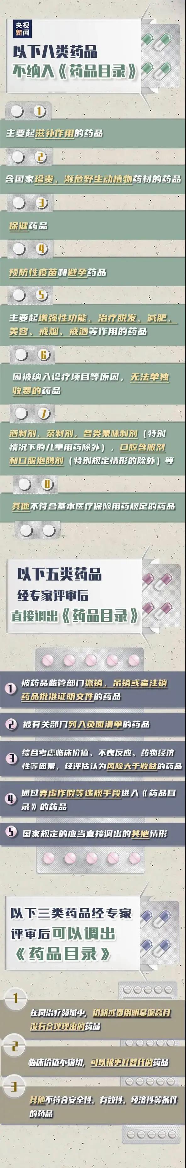 另外辦法明確了包括預(yù)防性疫苗,滋補藥品,保健藥品,脫發(fā)、美容減肥類等在內(nèi)的八類不得進入《藥品目錄》的藥品;規(guī)定了醫(yī)保基金的支付辦法等。 日常就醫(yī)問藥時 還有哪些藥品不可報銷? 藥品調(diào)入、出《藥品目錄》的標(biāo)準(zhǔn)是啥? 哪些可以用醫(yī)保基金支付? 一圖了解↓