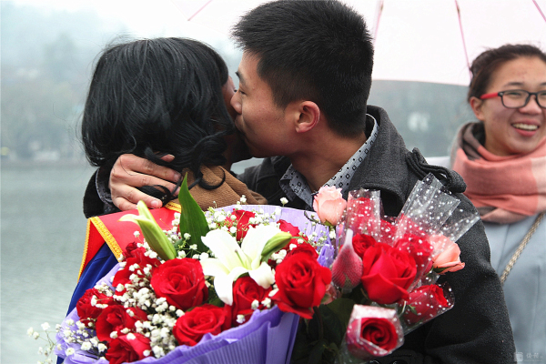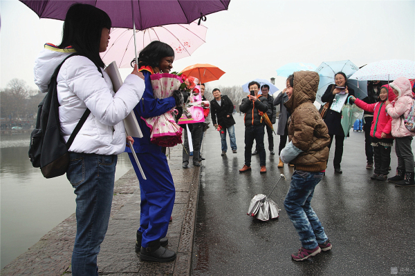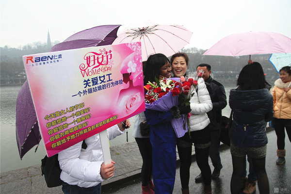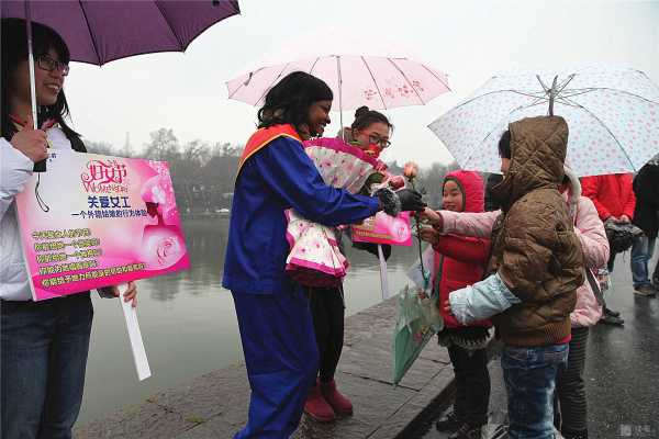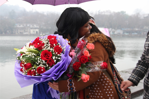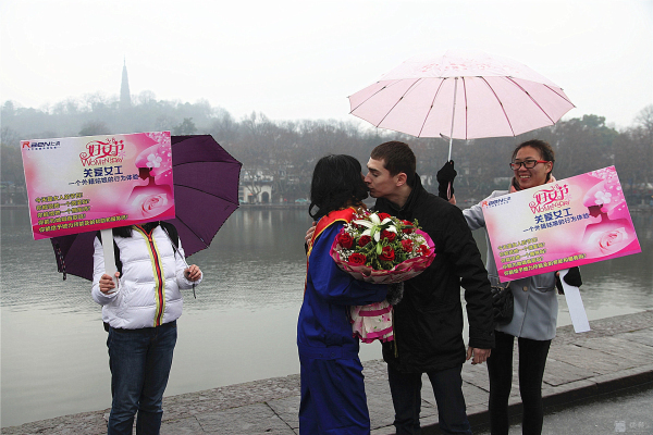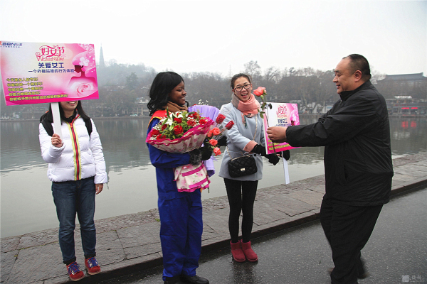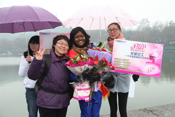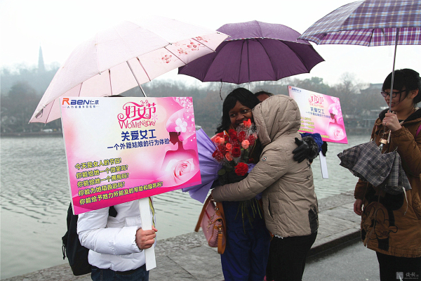 3月8日,國際婦女節(jié)。蘇堤煙雨,給西湖增添了一份神秘。 行人如織,彰顯西湖魅力。而斷橋邊,一位身材窈窕的黑人姑娘Sisi小姐佇立在細雨中,眾多人為她撐起雨傘,無數(shù)人給她獻上微笑,不斷有行人對她熱烈擁抱。 這是來自卡麥隆姑娘自發(fā)舉行的“三八節(jié),關(guān)愛女工行為體驗”。Sisi ,2012年來中國留學,為了能體驗文明的杭州和社會對女性的尊重、對女工的關(guān)愛,她萌生了這樣的“行為體驗”。 據(jù)sisi向記者介紹,她的這次主題為:“關(guān)愛女工”的行為體驗行動,以一個外籍務工者的身份,通過“給女工一個微笑,給女工一個擁抱,給女工唱首歌,給女工一支鮮花,給女工力所能及的服務”的體驗,親身檢驗一下文明的中國對女工的關(guān)愛程度,感受 “上有天堂下有蘇杭”的杭州人對女性的愛戴。 當記者問:您通過今天的行為實踐,收獲了什么?這位性格爽朗的卡麥隆姑娘,一臉微笑,喜形于色,用不很流利的中文對記者說:“哇,中國的朋友真的很熱情,杭州的朋友非常友好非常友善非常文明。我很幸福。” 或許她身旁的志愿者夏小姐向記者提供的記錄數(shù)據(jù)更具有說服力:詩詩的行為體驗活動只進行一小時,收獲鮮花 6束,散花729 支玫瑰,獲取1800 多人次的微笑,西湖邊下著雨,有56 人次先后為她撐起雨傘,有217人次熱情地給她擁抱,有3人現(xiàn)場給她唱歌。” Sisi的臉上難以抑制幸福與興奮,她活動著胳膊,無不得意地對記者說,“我接受擁抱,累得我胳膊都抬不起來了。”