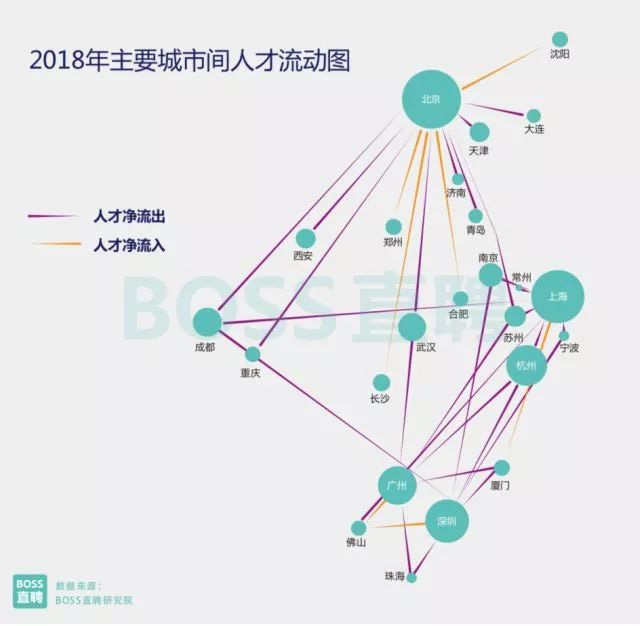 2 人才間的城市移動(dòng) 新一線(xiàn)城市人才爭(zhēng)奪戰(zhàn)加劇 杭州武漢成都鄭州西安成第一集團(tuán) 2017年,隨著“新一線(xiàn)”城市人才吸引政策的集中出臺(tái),城市間“搶人集團(tuán)”的排位雛形已經(jīng)顯現(xiàn)。 BOSS 直聘研究院數(shù)據(jù)顯示,2018年前兩個(gè)月,一線(xiàn)城市(北上廣深)人才繼續(xù)流出至二三線(xiàn)城市,凈流出率達(dá)到 0.6%,較2017年同期增加0.05個(gè)百分點(diǎn)。 相應(yīng)地,二線(xiàn)城市人才吸引力也繼續(xù)增強(qiáng),其中杭州、武漢、成都、鄭州、西安五個(gè)城市人才吸引力最高,2018年離開(kāi)北上廣深的求職者,有35.5%的人選擇了這五所城市。而且,這一趨勢(shì)已經(jīng)在18個(gè)月左右的區(qū)間里相對(duì)穩(wěn)定,這五個(gè)城市成為“新一線(xiàn)”城市搶人的第一集團(tuán)。