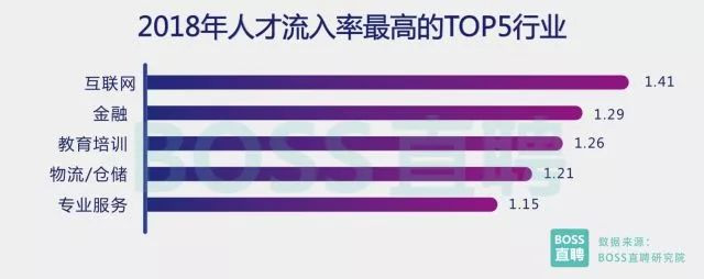 與薪資排名前十的行業(yè)相比,貿(mào)易、冶金、化工等傳統(tǒng)行業(yè)表現(xiàn)低迷,2018年平均招聘薪資普遍在6500元 以下,薪資增幅普遍低于1%,機(jī)械設(shè)備行業(yè)的平均薪酬還小幅下降了0.7%。 互聯(lián)網(wǎng)行業(yè)依然是最熱門(mén)領(lǐng)域 教育與物流行業(yè)異軍突起 根據(jù)BOSS直聘研究院的觀察,2018年求職旺季,人才流入率最高的五個(gè)行業(yè)中,互聯(lián)網(wǎng)和金融行業(yè)依然穩(wěn) 居前兩名。 有趣的是,教育培訓(xùn)和物流/倉(cāng)儲(chǔ)行業(yè),分別得益于知識(shí)經(jīng)濟(jì)崛起及營(yíng)商環(huán)境改善帶來(lái)的迅速發(fā)展, 人才吸引力大幅增強(qiáng)。2018年,這兩大領(lǐng)域人才凈流入比例甚至將過(guò)去深受求職者青睞的專(zhuān)業(yè)服務(wù)與通信行業(yè) 甩在身后。