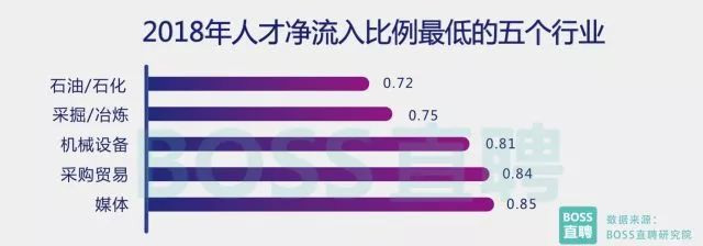 在新興行業(yè)沖擊下,傳統(tǒng)行業(yè)正在面臨愈發(fā)嚴(yán)峻的人才危機(jī)。BOSS直聘研究院數(shù)據(jù)顯示,以能源/化工為代 表的部分傳統(tǒng)行業(yè),人才凈流出比例正逐漸走高。 這種情況的出現(xiàn),一方面與部分傳統(tǒng)行業(yè)集中去產(chǎn)能和自動(dòng) 化水平升級(jí),導(dǎo)致崗位需求下降有關(guān),另一方面也與新興行業(yè)表現(xiàn)強(qiáng)勢(shì),人才吸引力超過(guò)傳統(tǒng)行業(yè)有很大關(guān)系。