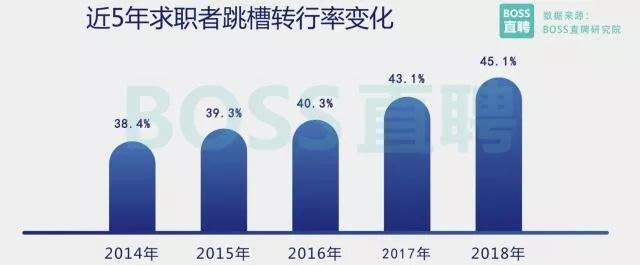 BOSS直聘研究院發(fā)現(xiàn),石油/石化和采掘/冶煉行業(yè)人才的流入/流出比連續(xù)三年下降,2018年跌破0.75。 而過(guò)去幾年人才吸引力尚能保持在中游位置的傳統(tǒng)媒體,人才流失率首次進(jìn)入倒數(shù)五位。 人才轉(zhuǎn)行情況更加普遍 產(chǎn)業(yè)間流動(dòng)迅速增長(zhǎng) 隨著新興行業(yè)的崛起以及行業(yè)間薪酬分化加劇,人才轉(zhuǎn)行率正加速上升。 BOSS直聘研究院數(shù)據(jù)顯示,2018 年,全行業(yè)人才整體轉(zhuǎn)行率已達(dá)45.1%,較5年前增加近7個(gè)百分點(diǎn),轉(zhuǎn)行現(xiàn)象正變得愈發(fā)普遍,產(chǎn)業(yè)間的人才流 動(dòng)正在迅速增長(zhǎng)。