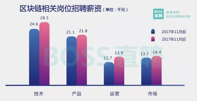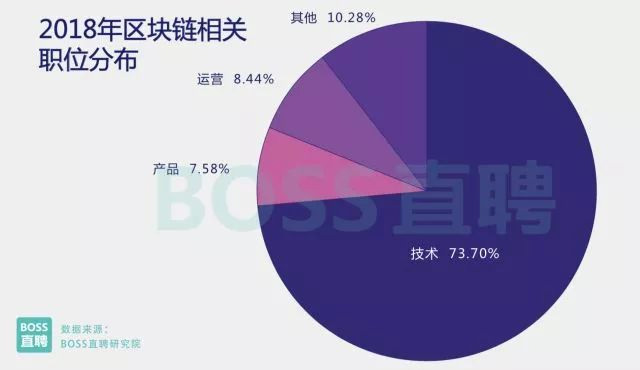 與海外相比,國(guó)內(nèi)區(qū)塊鏈人才供應(yīng)增長(zhǎng)態(tài)勢(shì)較為穩(wěn)定。2018年前兩個(gè)月,人才供應(yīng)量同比增加235%,增速 雖高于其他互聯(lián)網(wǎng)職位,但存量仍遠(yuǎn)低于實(shí)際需求。 截至2018年2月,專(zhuān)業(yè)區(qū)塊鏈技術(shù)人才的供需比僅為0.15,嚴(yán)重不足(人工智能相關(guān)人才的供需比為0.62。 人才供需比低于1說(shuō)明人才供不應(yīng)求,數(shù)值越低表明缺口越高)。 2017年11月之前,區(qū)塊鏈相關(guān)崗位的平均招聘薪資為2.32萬(wàn)元。2017年11月之后,區(qū)塊鏈相關(guān)崗位的平均 招聘薪資達(dá)到2.58萬(wàn)元。 2、區(qū)塊鏈相關(guān)崗位類(lèi)型和地域分布 區(qū)塊鏈成為風(fēng)口之后,圈內(nèi)不可避免地出現(xiàn)一些掛羊頭賣(mài)狗肉的蹭風(fēng)口型崗位,只是加上區(qū)塊鏈三個(gè)字, 薪資便能提升一截。 然而B(niǎo)OSS直聘研究院通過(guò)技能與職位相關(guān)性分析發(fā)現(xiàn),目前市面上的擦邊球崗位并不多, 90%的職位為專(zhuān)業(yè)區(qū)塊鏈相關(guān)崗位。 從職位分布上看,有73.7%的區(qū)塊鏈相關(guān)崗位為技術(shù)類(lèi),7.5%為產(chǎn)品類(lèi)、 8.4%為運(yùn)營(yíng)類(lèi),還有10%其他崗位(包括行業(yè)分析師、市場(chǎng)推廣、記者等)。