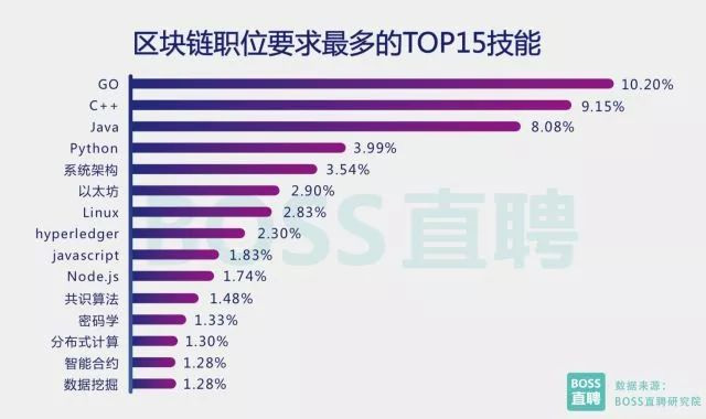 4、區(qū)塊鏈相關(guān)崗位的技能要求 BOSS直聘研究院發(fā)現(xiàn),超過(guò)80%的區(qū)塊鏈相關(guān)職位對(duì)求職者的技能要求在3項(xiàng)及以上,技術(shù)類(lèi)人才除了需掌 握常用開(kāi)發(fā)語(yǔ)言外(C++,Java,Go),還需要對(duì)密碼學(xué)、共識(shí)算法、超級(jí)賬本、智能合約等有足夠了解。