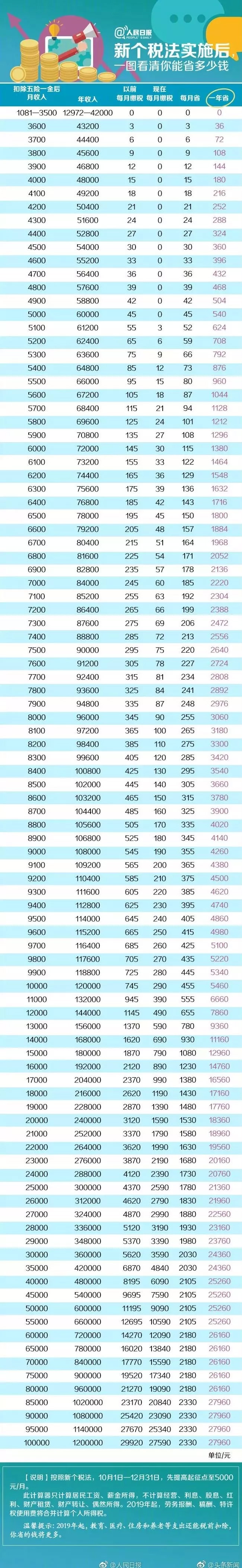 提醒6:新個稅計算公式: 1.應(yīng)納稅所得額=年度收入-基本減除費用6萬元(起征點)-專項扣除費用-專項附加扣除費用-依法確定的其他扣除。 2.應(yīng)納個稅金額=應(yīng)納稅所得額*稅率-速算扣除數(shù)。 提醒7:勞務(wù)報酬所得、稿酬所得、特許權(quán)使用費所得這三項,需經(jīng)過減除或減征后,再進行綜合征稅。按照收入額的20%進行費用扣除,體現(xiàn)的是對取得這三類勞動所得所發(fā)生的成本類費用的扣除,符合凈所得課稅的原理。特別是其中的稿酬所得,相當于兩次‘優(yōu)惠’,先減除20%費用再按照70%計算。 再回到本文的重點:這一次個稅改革,大家到底能省多少錢?人民日報的這張圖可以說很貼心了,快來瞅瞅,自己能省多少就都明明白白了。