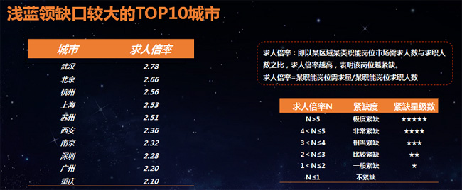 城市淺藍(lán)領(lǐng)求人倍率指數(shù) “淺藍(lán)領(lǐng)”供需呈現(xiàn)中心城市對(duì)周邊區(qū)域的“虹吸”效應(yīng)。一線城市“淺藍(lán)領(lǐng)”主要來(lái)自周邊省份,非一線城市多來(lái)自省內(nèi)。從招聘規(guī)模來(lái)看,北上廣深的招聘規(guī)模位于第一梯隊(duì),武漢、成都緊隨其后。從求職端來(lái)看,“淺藍(lán)領(lǐng)”最愿意去的城市為上海,其次為廣州,深圳,成都也較受“淺藍(lán)領(lǐng)”歡迎,北京由于實(shí)施人口疏解政策,整體生活成本較高,在“淺藍(lán)領(lǐng)”求職意向城市中位居第五位。為了對(duì)比各城市“淺藍(lán)領(lǐng)”崗位緊缺程度,白皮書(shū)采用了求人倍率指標(biāo),指標(biāo)顯示,武漢“淺藍(lán)領(lǐng)”缺口*大,其次為北京。