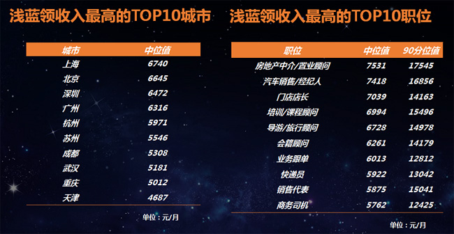 淺藍(lán)領(lǐng)收入TOP10城市&職位 上海是“淺藍(lán)領(lǐng)”收入最高的城市,中位值為6,740元,其次是北京,中位值為6,645元(注:白皮書(shū)中月薪指稅前應(yīng)發(fā)工資,包括績(jī)效獎(jiǎng)金)。非一線城市中,杭州、蘇州“淺藍(lán)領(lǐng)”薪酬相對(duì)領(lǐng)先。此外,成都、武漢等熱點(diǎn)城市隨著服務(wù)業(yè)快速發(fā)展,“淺藍(lán)領(lǐng)”薪酬中位值達(dá)到5,000元以上。“淺藍(lán)領(lǐng)”從業(yè)者中,房地產(chǎn)中介/置業(yè)顧問(wèn)、汽車(chē)銷(xiāo)售/經(jīng)紀(jì)人、門(mén)店店長(zhǎng)位列前三。業(yè)務(wù)跟單、快遞員、銷(xiāo)售代表、商務(wù)司機(jī)等收入也比較亮眼。另外數(shù)據(jù)顯示,“淺藍(lán)領(lǐng)”繳納社會(huì)保險(xiǎn)意愿整體不高,其中40.5%的“淺藍(lán)領(lǐng)”不愿繳納社保,希望足額繳納社保占比為27.4%。“淺藍(lán)領(lǐng)”普遍年輕,職場(chǎng)穩(wěn)定性較差,更希望獲得更多現(xiàn)金性收入,這亦給企業(yè)合規(guī)繳納社保帶來(lái)一定挑戰(zhàn)。 |