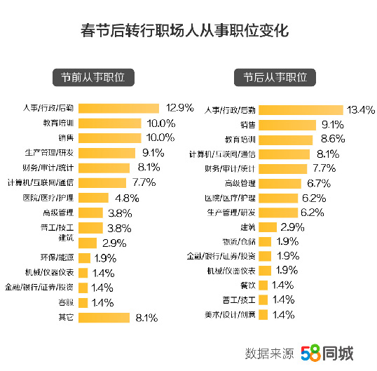 轉(zhuǎn)行偏愛銷售行業(yè),行政是換工作首選職位 據(jù)58同城調(diào)研數(shù)據(jù)顯示,春節(jié)前有轉(zhuǎn)行計劃的職場人從事的Top3行業(yè)分別是人事/行政/后勤、建筑、教育培訓,春節(jié)后職場人期望從事的Top3行業(yè)分別是銷售、人事/行政/后勤、金融/銀行/證券/投資。其中,有19.7%的職場人希望在春節(jié)后轉(zhuǎn)行進入銷售行業(yè),春節(jié)前從事該行業(yè)的被訪者占比僅為6.6%。由于銷售行業(yè)屬于多勞多得的行業(yè),許多職場人希望通過從事這一行業(yè)來改善收入水平,在春節(jié)后獲得更高的收入。 從具體城市來看,一線城市職場人轉(zhuǎn)行的主要原因是為實現(xiàn)自我突破,以期得到更好的發(fā)展。一線城市職場人轉(zhuǎn)行更愿意從事銷售和金融等挑戰(zhàn)性大的行業(yè),新一線職場人更偏好選擇人事、銷售、教育等行業(yè)作為新的開始。