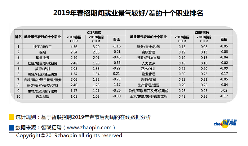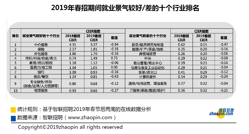 從求職端的數據來看,春招期間找工作的人數同比增加了4%,簡歷投遞次數同比增加18%,這表明單個求職者較去年投遞了更多的簡歷,且求職人數在增加,需求人數在減少的趨勢將整體影響今年春招的就業(yè)景氣度。 2019年春招期間就業(yè)景氣度低于去年 綜合供需兩端的情況,2019年春招期間的CIER指數降為1.55,較2018年的1.68略有下滑,證明今年春招期間的求職競爭程度更激烈,平均一個求職者對應1.55個用人需求。 二、東部就業(yè)形勢墊底,中介服務業(yè)的景氣度高居榜首 東部地區(qū)春招就業(yè)景氣度落后東北,一線城市競爭依然激烈 數據顯示,2019年春招期間CIER指數仍呈現中部、西部、東北以及東部地區(qū)依次遞減的趨勢。同比來看,今年的CIER指數較去年均略有下滑,東部地區(qū)產業(yè)發(fā)展比較先進,人才競爭也比較集中,因此春招旺季這一地區(qū)的就業(yè)壓力也是*大的,景氣度墊底。 從不同城市等級看,2019年春招期間CIER指數仍呈現一線、新一線、二線、三線及四線城市依次遞增的趨勢。其中,僅三、四線城市的CIER指數大于1,表明在這些城市中,企業(yè)招聘需求人數要大于求職申請人數;一線、新一線、二線城市的CIER指數小于1,說明企業(yè)招聘需求人數要小于求職申請人數。智聯招聘調研顯示,大多數求職者仍然希望在更大的城市就業(yè),因此大城市的競爭也往往會更激烈。 中介服務業(yè)的景氣度高居榜首,傳統(tǒng)加工制造業(yè)轉型陣痛依然明顯 數據顯示,從2019年春季求職期間排名結果來看,就業(yè)形勢最好的行業(yè)是中介服務業(yè),CIER指數高達3.37,其次是保險及外包服務,CIER指數分別為1.81、1.70。服務業(yè)為代表的第三產業(yè)因為服務業(yè)的升級和社會轉型的需要,正在持續(xù)釋放需求,吸納就業(yè)的能力十分強大。值得注意的是,2019年春招期間,在就業(yè)形勢較好的前十大行業(yè)中,除了信托/擔保/拍賣/典當和醫(yī)藥/生物/工程的CIER指數是高于2018年春季求職的,其他的行業(yè)的CIER指數都低于去年。 在就業(yè)景氣較差的行業(yè)中,2019年春招期間航空/航天研究與制造業(yè)的就業(yè)景氣程度最差,CIER指數僅為0.15,其次是能源/礦產/采掘/冶煉業(yè),為0.20,傳統(tǒng)加工制造業(yè)的就業(yè)形勢仍然堪憂,在去年備受關注的貿易/進出口行業(yè),在春招旺季景氣度同比下行。