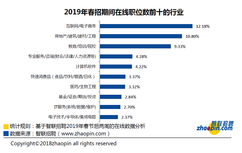 大企業(yè)薪酬誘人,小微企業(yè)工資低于平均線 數據顯示,2019年春招期間,企業(yè)規(guī)模越大,平均薪酬越高。在10,000人以上的巨無霸企業(yè)工作的員工,平均薪酬最高,為9,329元,其次是1,000-9,999人的大公司,平均薪酬為9,053元,平均薪酬最低的是小微企業(yè)的員工,為7,601元。企業(yè)規(guī)模越大,意味著具有成熟的盈利能力和完善的薪酬福利體系,員工的利益能夠得到*大程度的保障,因此平均薪酬越高。 外商薪酬最高,民營企業(yè)的平均薪酬最低 數據顯示,2019年春招期間,外企的平均薪酬最高,為9,070元,其次是上市公司,平均薪酬為8,913元,薪酬最低的是民營企業(yè),平均薪酬僅為8,025元。 四、互聯網、房地產行業(yè)人才彈藥充足,教育、醫(yī)藥工程等新興熱門行業(yè)招工難 互聯網/電子商務行業(yè)用工需求*大 智聯招聘數據顯示,從春季需求量*大的十大行業(yè)來看,互聯網/電子商務、房地產/建筑/建材/工程、教育/培訓/院校行業(yè)成為前三甲。這個排名和2018年的保持一致,盡管互聯網行業(yè)經過了2018年招聘需求全線下降的經歷,仍然是穩(wěn)坐吸納就業(yè)的寶座的“頭號玩家”。值得注意的是,電子技術/半導體/集成電路進入了需求前十的行業(yè),這和國家去年開始大力支持中國發(fā)展自己的芯片有關,政策的傾斜會讓電子技術/半導體/集成電路行業(yè)的市場更加廣闊,因此企業(yè)的用人需求也隨之大增。既然有新的行業(yè)上榜,也就代表有其他的行業(yè)熱度在下降,貿易/進出口行業(yè)在2018年在企業(yè)發(fā)布的在線職位數中排名第八,今年的排名下滑到第11名,或受到中美貿易摩擦對發(fā)展信心的影響所致。