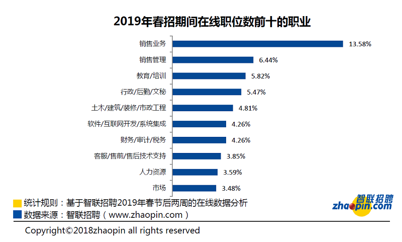 教育/培訓/院校持行業(yè)人才缺口大 智聯招聘數據顯示,從春季供給量*大的十大行業(yè)來看,排名前三的行業(yè)是房地產/建筑/建材/工程、互聯網/電子商務、計算機軟件行業(yè),其中房地產/建筑/建材/工程行業(yè)的求職人數遠大于企業(yè)需求,而近年來持續(xù)釋放需求的教育/培訓/院校行業(yè)卻面臨門可羅雀的尷尬處境,盡管該行業(yè)的簡歷投遞熱度不低,但是距離行業(yè)的實際需求仍有一定的差距。 開疆拓土,銷售人員需求最旺 智聯招聘數據顯示,從春季需求量*大的十大職位來看,銷售業(yè)務、銷售管理、教育/培訓排名前三,而2018年前三大職位是銷售業(yè)務、行政/后勤/文秘、軟件/互聯網開發(fā)/系統(tǒng)集成。其中銷售相關崗位位居需求榜首,不難理解,在企業(yè)追求發(fā)展盈利的過程中,急需銷售角色的員工開拓市場,貢獻利潤。在春招期間需求次之的是行政、財務、人力資源等職能型崗位,這類崗位是公司經營管理的基礎,不可或缺,用人需求長期存在。