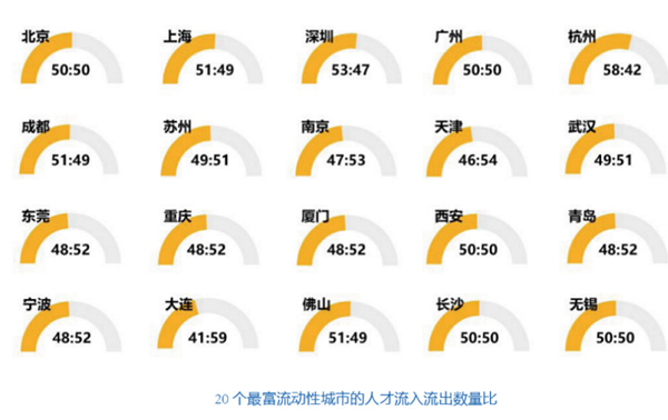 在薪酬方面,新一線城市的總體薪酬水平緩步提升,但與一線城市相比仍存在明顯差距。以薪酬水平居于全國新一線城市首位的杭州為例,年薪酬指數(shù)與北上廣深相比仍有較大差距,但權(quán)衡較低的生活成本和競爭壓力,一定程度上可以抵消薪酬差距,未能影響這些新一線城市對人才流入的吸引力。綜合來看,新一線城市就業(yè)機會多、人才落戶難度較小、生活成本較低、生活環(huán)境好等城市優(yōu)勢對本地和外地人才均有強大的吸引力,正強勢趕超以往在人才方面占據(jù)絕對優(yōu)勢的一線城市。