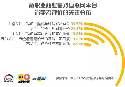 4、新職業(yè)從業(yè)者推崇專(zhuān)業(yè)主義。超六成新職業(yè)從業(yè)者認(rèn)為,有過(guò)硬的專(zhuān)業(yè)技術(shù)和手藝是優(yōu)秀新職業(yè)從業(yè)者的特征。在新職業(yè)從業(yè)者最想對(duì)客戶(hù)說(shuō)的話(huà)中,“相信我們是專(zhuān)業(yè)的”排名居首。 5、新職業(yè)從業(yè)者重視互聯(lián)網(wǎng)平臺(tái)的用戶(hù)反饋。35.5%的新職業(yè)從業(yè)者非常關(guān)注美團(tuán)、大眾點(diǎn)評(píng)上的消費(fèi)者評(píng)價(jià),甚至作為績(jī)效考核的參考標(biāo)準(zhǔn),美團(tuán)、大眾點(diǎn)評(píng)上的消費(fèi)者評(píng)價(jià)的好壞直接影響提成的額度;25.5%的新職業(yè)從業(yè)者會(huì)主動(dòng)回復(fù)評(píng)價(jià),與消費(fèi)者互動(dòng),維護(hù)好客情關(guān)系。