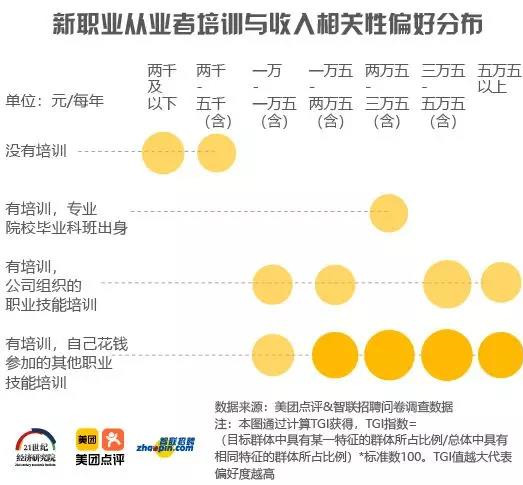 7、參加優(yōu)質(zhì)且針對(duì)性強(qiáng)的職業(yè)培訓(xùn),是提升新職業(yè)從業(yè)者收入的重要渠道。TGI指數(shù)顯示,培訓(xùn)投入與獲得的收入直接相關(guān)。若新職業(yè)從業(yè)者沒(méi)有參加過(guò)培訓(xùn),月薪在2000元以下及2000-5000元(含)之間的分布更多;若參加過(guò)公司組織的職業(yè)技能培訓(xùn),月薪在10000元以上的分布更高;若新職業(yè)從業(yè)者自費(fèi)參加其他的職業(yè)技能培訓(xùn),月薪在15000元以上的分布更高,且獲得更高薪酬的可能性進(jìn)一步加大。