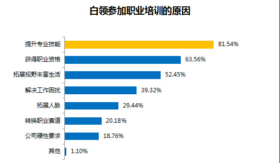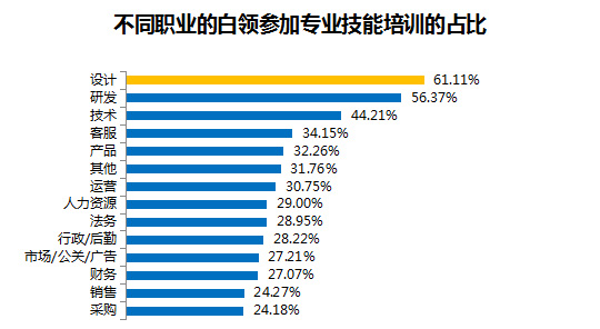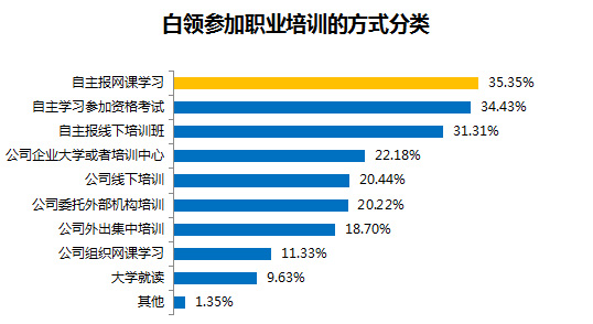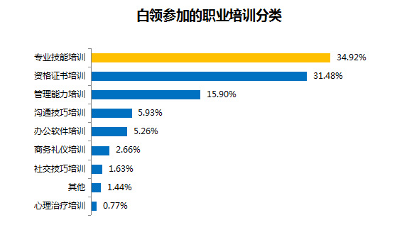 不過,在一些企業(yè)中也有要求白領參加職業(yè)培訓的,表現最為突出的是機關事業(yè)單位,達25.55%,私營企業(yè)要求員工參加職業(yè)培訓所占比重最少,僅17.16%。 調查顯示,白領參加過專業(yè)技能培訓占比最多,達到34.92%,其次是資格證書培訓占比31.48%,這與從業(yè)的崗位息息相關,譬如財務、人力資源等;在練就硬實力的同時越來越多的人注重軟實力的培養(yǎng),管理能力培訓就以15.9%的占比成為了職業(yè)培訓中的參與率第三。