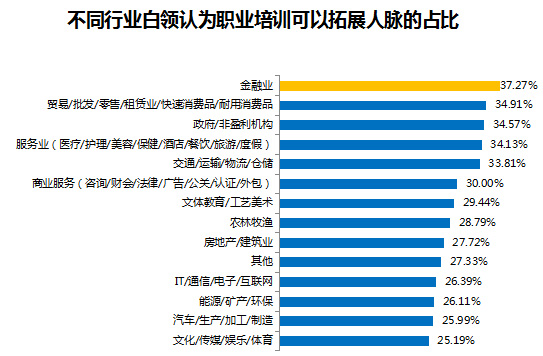 調查發(fā)現,部分行業(yè)對于拓展人脈也比較看重,金融業(yè)認為職業(yè)培訓可以拓展人脈的占比達37.27%,居行業(yè)首位;貿易、服務業(yè)等這類普遍需要人際關系助力的行業(yè)中,也有超過三成的職場人參加培訓的初衷是為了拓展人脈。