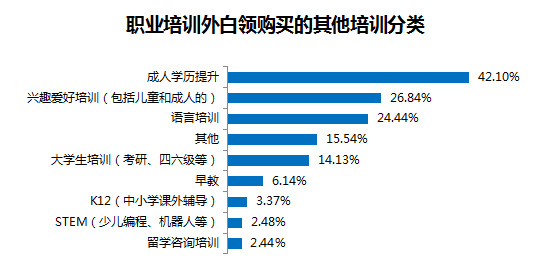 財務崗位的職場人最重視資格證書,選擇參加資格證書的培訓遠超其他崗位,達到58.51%,人力資源和法務崗位參與過資格證書培訓的人大約在40%左右。 白領管理能力培訓持續(xù)火熱,薪資愈高愈受追捧,70后參與度最高 從薪資來看,月薪10,000元以上的白領參加管理能力培訓的比例均超過了24%,其中15,001-20,000元區(qū)間的占比最高,達到31.67%,總體來說薪資水平越高對管理能力培訓需求越高。 從年齡來看,注重自身管理能力培訓的人群中,70后白領參與度最高,占比29.47%,其次是60后占比27.37%,而作為職場主力軍的80、90后則需要更多的職場磨練,核心硬實力的提升仍是首要目標。 從企業(yè)性質來看,外資及合資企業(yè)員工重視管理能力培訓的人群,分別占比21.79%和19.71%,這與自由開放的企業(yè)文化密不可分,國外文化的引入讓白領跟注重軟實力的提升,國內企業(yè)中,民營企業(yè)以15.93%的占比排在第三位。 除職業(yè)培訓外,工齡越長越重視成人學歷培訓,興趣愛好培訓更受年輕人喜愛 在職業(yè)培訓之外,白領還會購買其他類型的教育培訓,成人學歷提升服務成為眾多職場人首選,有42.1%的人購買過該類培訓課程,工齡越長的白領越重視成人學歷提升,北上廣深一線大城市尤為突出。興趣愛好培訓是僅次于成人學歷提升人們更樂意購買的教育培訓,達26.84%,體現了當代職場人注重職業(yè)能力的同時,也非常注重家庭與生活品質的提升。