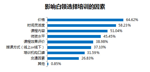 第二部分:評價與期望 近四成白領不滿意當前職業(yè)培訓,認為效果不理想且價格高,愈年輕滿意度愈低 越來越多白領選擇進行職業(yè)培訓,職業(yè)培訓的重要性不言而喻,職業(yè)培訓滿意度成為不可低估的一項指標。數據顯示,白領對自己參加的職業(yè)培訓的整體滿意度為4.19,選擇滿意的占比73.82%,選擇不滿意的占比3.06%。 通過對職業(yè)培訓不滿意的原因調查,“培訓效果不理想”和“培訓價格過高”是對課程不滿最為主要的原因,分別占比39.04%、38.64%,概括來說主要是職業(yè)培訓的性價比不高。培訓機構或企業(yè)在讓員工參與到職業(yè)培訓的同時更應該注重培訓的質量。 從年齡結構來看,90后、95后對于課程的滿意度要低于70后和80后,95后對培訓課程的滿意度僅為4.03。90后、95后進入職場時間較短,需要熟悉和學習的地方有很多,一般的職業(yè)培訓難以達到全方位立體化效果,同時,此類新一代職場人在接受信息的方式上,與傳統(tǒng)培訓的表達方式上有所差異,課程內容多樣性與課程形式的生動性,可能會對其產生不同的培訓效果,這可能是他們對培訓不滿的重要原因。 價格是白領選擇培訓的主要考慮因素,女性白領對時間靈活度要求大于男性。 選擇進行職業(yè)培訓,白領們有很多的因素需要考慮。數據顯示,64.62%的白領將價格作為選擇培訓的首要因素,58.23%的白領將時間靈活度作為第二考慮因素。