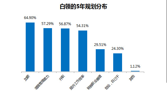 對比男女對時間靈活度的選擇,63.33%的女性白領認為時間靈活度是主要考慮因素,較男性白領的占比多出10個百分點,這或許與不同性別角色所存在的家庭因素聯系緊密。 對于未來5年職業(yè)發(fā)展規(guī)劃,超六成白領最渴望的是加薪,工作十年以上更渴求增強管理能力 個人所參與的職業(yè)培訓與未來的職業(yè)發(fā)展規(guī)劃聯系緊密,數據顯示,白領對于自己的下一個5年規(guī)劃中64.9%的白領渴望加薪,57.29%的白領渴望增強管理能力,56.87%的白領渴望升職;女性白領的職業(yè)發(fā)展渴望要大于男性。工作年限與升職提升工作效率呈反比趨勢,工作十年以上的白領對自己的管理能力的提升期望較大,這大多與自身所處職位密切相關。