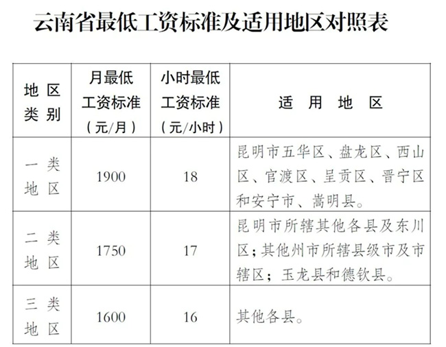 01 多省市公布2022最新最低工資標準 人社部2015年發(fā)文明確,在今后一段時間內,將最低工資標準由每兩年至少調整一次改為每兩年至三年至少調整一次。 一、北京、上海:2022年最低工資不作調整 2022年7月初,北京市人力資源和社會保障局發(fā)文明確,2022年北京市最低工資標準不調整: 全日制從業(yè)人員最低工資標準繼續(xù)為每月不低于2320元; 非全日制從業(yè)人員小時最低工資標準繼續(xù)為不低于25.3元/小時; 非全日制從業(yè)人員法定節(jié)假日小時最低工資標準繼續(xù)為不低于59元/小時。 6月28日,上海人力資源和社會保障局發(fā)文表示,考慮到新冠肺炎疫情對上海市經濟社會的影響,經市勞動關系三方共同研究,2022年上海市最低工資標準不調整: 適用于全日制就業(yè)勞動者的月最低工資標準繼續(xù)為2590元; 適用于非全日制就業(yè)勞動者的小時最低工資標準繼續(xù)為23元。 二、四川、云南、重慶、福建等四省市上調2022年最低工資標準 2022年8月16日,云南省人社廳公布《關于調整最低工資標準的通知》,通知中明確將從2022年10月1日起調整云南省最低工資標準,三檔分別為1900元、1750元、1650元。 詳情如下表: