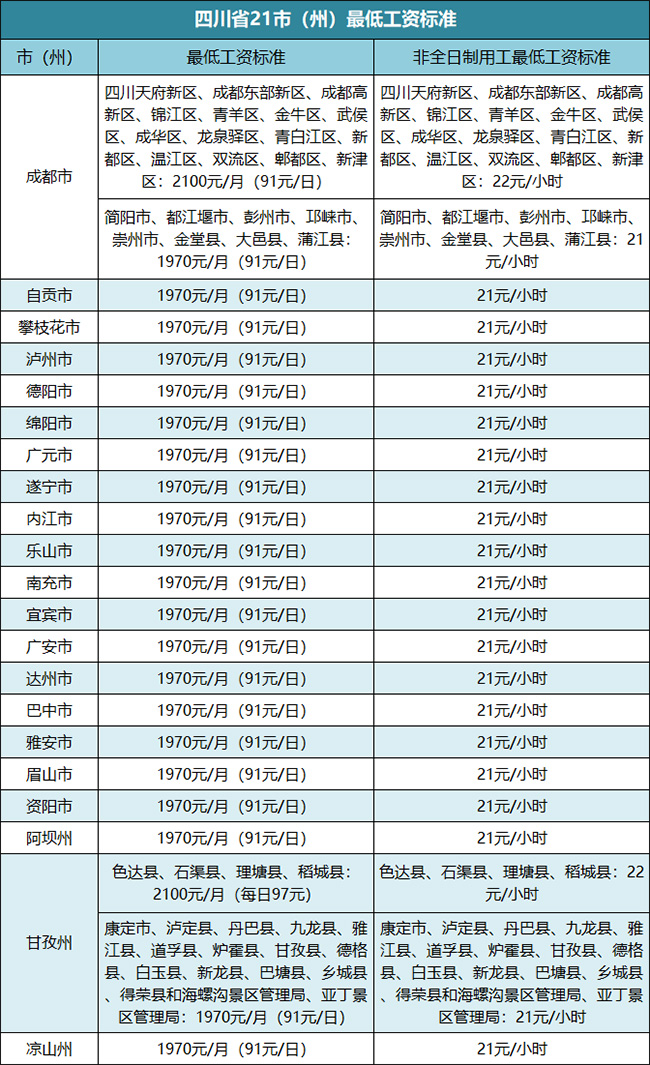 2022年3月,四川省人民政府發(fā)布《四川省人民政府關于調整全省最低工資標準的通知》,明確自2022年4月1日起調整全省最低工資。 一、調整后全省月最低工資標準 第一檔:每月2100元(每日97元); 第二檔:每月1970元(每日91元); 第三檔:每月1870元(每日86元)。 二、調整后全省非全日制用工小時最低工資標準 第一檔:每小時22元; 第二檔:每小時21元; 第三檔:每小時20元。 詳情可查看下表:
