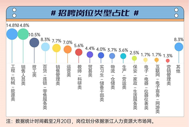 軟硬件綜合開發(fā)工程師、外貿(mào)運營專員、招商運營專員……2月20日9時至12時,杭州市高校畢業(yè)生就業(yè)專場招聘會在杭州市人才市場舉行,77家參會企業(yè)累計提供248個崗位和1661個用人需求。以這場招聘會為代表,今年春節(jié)假期后,杭州啟動“新春引才服務(wù)月”活動——2月6日至3月7日,杭州市級層面平均每2天就有1場招聘活動。 在這場春日的人才盛宴中,既有老牌巨頭拋出的“橄欖枝”,也不乏新興企業(yè)開出的6萬月薪“英雄帖”。當下招聘會的展位還在更新,為每一位追夢人鋪設(shè)通向未來的快車道。我們梳理了杭州人才網(wǎng)活動主頁內(nèi)的17場招聘會信息,為來杭求職者提供一份求職“秘籍”。 去“杭州六小龍”工作還有機會嗎? 人才需求總量突破3.5萬人 作為開年引才的重要節(jié)點,本次“新春引才服務(wù)月”的每一場招聘活動都誠意滿滿,爭取滿足不同求職者的多重選擇。在總計17場招聘活動中,1500余家參會企業(yè)累計釋放優(yōu)質(zhì)崗位超2600個,人才需求總量突破3.5萬人。觀察發(fā)現(xiàn),制造業(yè)、互聯(lián)網(wǎng)及科創(chuàng)企業(yè),可謂是系列招聘會中的“三巨頭”,參與企業(yè)數(shù)量占比超五成,“租賃和商務(wù)服務(wù)業(yè)”“批發(fā)和零售業(yè)”緊隨其后,分別占比8.8%和7.3%。