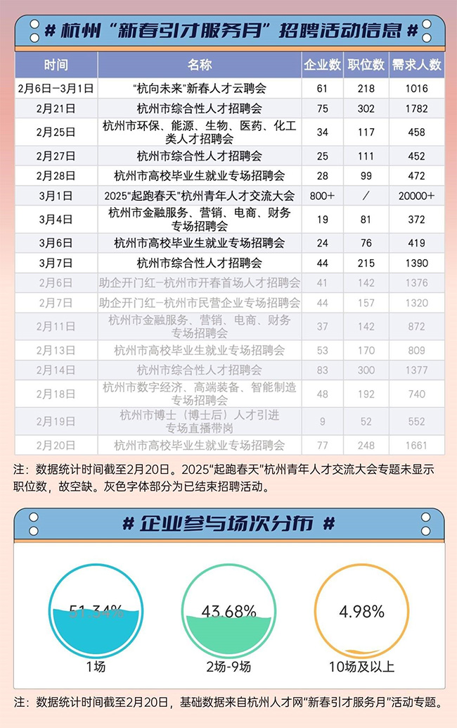 不只有常見的崗位,統(tǒng)計還發(fā)現(xiàn),本次“新春引才服務(wù)月”活動中還有諸如“白領(lǐng)育兒師”“養(yǎng)老規(guī)劃師”“健康管理師”等新興職業(yè)引關(guān)注。如有公司擬招聘20位“白領(lǐng)育兒師”,以“指導寶媽科學母乳喂養(yǎng)的方法”;有公司擬招聘10位“廢舊辦公家具回收與再利用技術(shù)”方向的博士,重點“研制木質(zhì)家具一體成型”等技術(shù)……小眾新興職業(yè)需求讓就業(yè)市場的生態(tài)更加多元和豐富。 錯過招聘會還有機會嗎? 云招聘、直播帶崗等形式打破限制 剛在網(wǎng)上看到適合自己的心動企業(yè)、心動崗位,卻發(fā)現(xiàn)招聘會已經(jīng)結(jié)束?別擔心,杭州“新春引才服務(wù)月”活動剛剛過半,還有9場活動在等著你。這幾場活動大都是線下招聘會,舉辦地主要集中在杭州市人才市場(環(huán)城北路167號匯金國際D座),時間均為當天9時至12時。其中,3月1日將在杭州大會展中心舉辦的2025“起跑春天”杭州青年人才交流大會規(guī)模最大,參與企業(yè)超800家,覆蓋智能物聯(lián)、高端裝備、生物醫(yī)藥等領(lǐng)域。 梳理還發(fā)現(xiàn),這次有超百家企業(yè)參與了不止一場的招聘會,其中還有4.98%的企業(yè)參加了10場(含)以上的招聘活動,查詢企查查發(fā)現(xiàn),這些參與10余場招聘活動的企業(yè)多為成立10年內(nèi)的小微企業(yè),包括浙江省科技型中小企業(yè)等,可見這些企業(yè)對人才的強烈渴望。