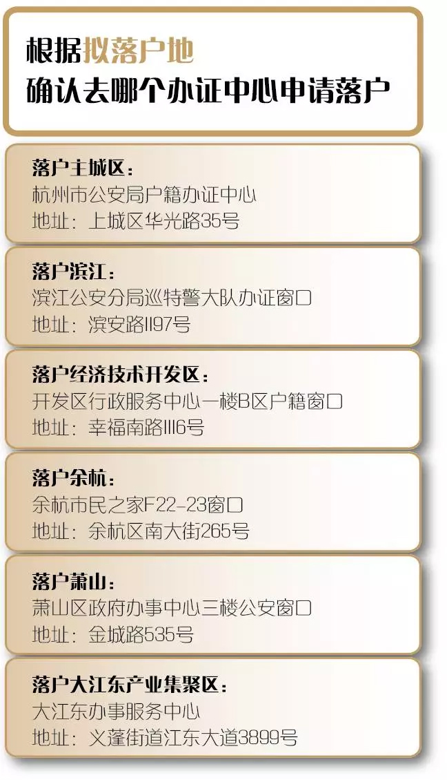 到哪里申請(qǐng)辦理高技能人才落戶(hù)? 申請(qǐng)落戶(hù)在杭州主城區(qū)的到杭州市公安局戶(hù)籍辦證中心(華光路35號(hào))辦理,落戶(hù)在濱江區(qū)、經(jīng)濟(jì)開(kāi)發(fā)區(qū)、余杭區(qū)、蕭山區(qū)、大江東產(chǎn)業(yè)集聚區(qū)的前往當(dāng)?shù)毓卜志?辦證中心)申請(qǐng)辦理。(具體地址請(qǐng)見(jiàn)下圖)