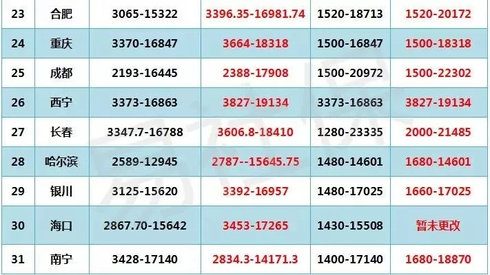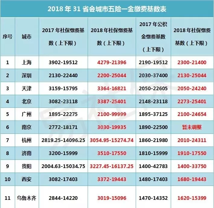 疑問二:企業(yè)與個人將補繳共計近2萬億元? 人民日報:有地方稅務(wù)人士透露,目前稅務(wù)部門與人社部門強調(diào)穩(wěn)定為主,并沒有談?wù)搹娀鞴堋嶋H上從明年開始,像社保繳費登記、變更信息、人數(shù)等仍由人社部門負(fù)責(zé)。 稅務(wù)部門只負(fù)責(zé)社保費的申報和征收,對社保費的稽查暫未確定。因此社會上擔(dān)心明年開始征管大幅加強并沒有道理。 疑問三:30%的利潤要沒,超七成的企業(yè)日子將難過了? 人民日報:針對社保費的政策并沒有變化,變化的只是征管方式。征管能力增強后,國家會統(tǒng)籌考慮,根據(jù)實際調(diào)整。專家表示,稅務(wù)部門負(fù)責(zé)征收社保費之后,征管能力確實會增強。但國家層面會考慮企業(yè)負(fù)擔(dān)實際問題,在當(dāng)前情況下不太可能出現(xiàn)企業(yè)負(fù)擔(dān)飆升的情況。 實際上,我國社保費率已階段性降低。2015年以來,我國先后4次降低社保費率,總體社保費率從41%降到37.25%,減少企業(yè)成本約3150億元。 總結(jié): 社保費率降低但是今后社保將有稅務(wù)統(tǒng)一征收,一方面節(jié)省企業(yè)用人成本;另一方面提高員工社保待遇,對誰都是有利的,所以大家不要在再質(zhì)疑了。 5、2018年各大城市社保繳費基數(shù)表出爐!工資少了?待遇能漲么? 總有人問這個城市調(diào)基了沒,那個城市調(diào)基了沒,基數(shù)是多少?為此kavin特地整理了31個省會城市五險一金繳費基數(shù),快來看看你所在城市漲了多少!