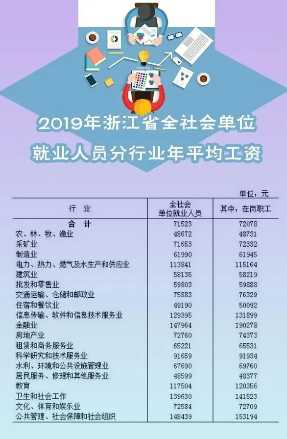 近日,浙江省統(tǒng)計局發(fā)布《2019年浙江省全社會單位就業(yè)人員年平均工資統(tǒng)計公報》。 2019年,浙江省全社會單位就業(yè)人員年平均工資為71523元,比上年增加5625元,增長8.5%,扣除價格因素增長5.4%。