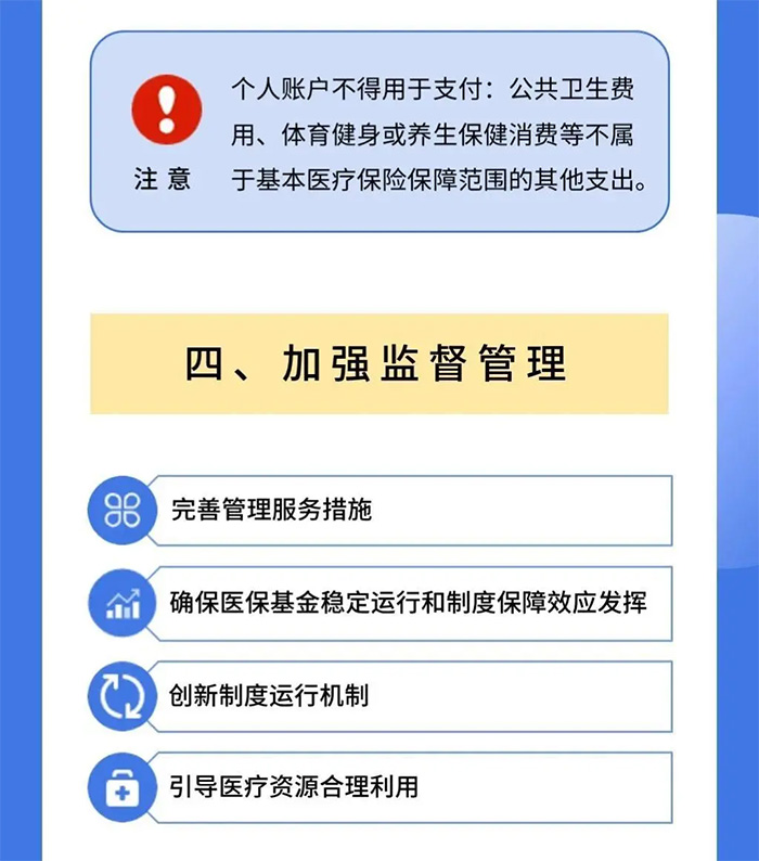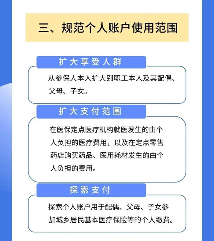 變化三:個人賬戶使用范圍擬擴大范圍 這個變化最直接的影響就是:個人帳戶的使用范圍擴大了。 醫(yī)保卡屬于個人卡,只能自己使用,如果外借給他人,很可能違規(guī)、違法。 目前只有少部分城市開放了醫(yī)保卡家人共享功能,絕大多數(shù)城市依然禁止醫(yī)保卡外借。 而國家醫(yī)保局公布這份《征求意見稿》后,未來極有可能全國都會開放醫(yī)保卡家人共享:不僅可以自己使用,也可以給配偶、父母和子女支付自付的醫(yī)療費,或者在藥店給他們買藥。 這樣一來,以后我們醫(yī)保個人帳戶里用不上的錢,就可以拿來給爸媽看病拿藥了,這樣還能幫爸媽省點錢~ 下面一圖帶你了解醫(yī)保大變化