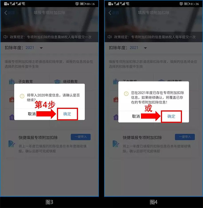 ② 依據(jù)提示“將帶入2020年度信息,請確認是否繼續(xù)?”或者“您在2021年度已存在專項附加扣除信息,如果繼續(xù)確認,將覆蓋已存在的專項附加扣除信息!”,確認后點擊“確定”;如下圖3、圖4: