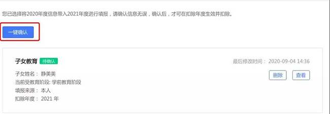 ③ 打開“待確認”狀態(tài)的專項附加扣除,核對信息;如有修改,可以點擊“修改”,信息確認后點擊“一鍵確認”。如下圖5、圖6: