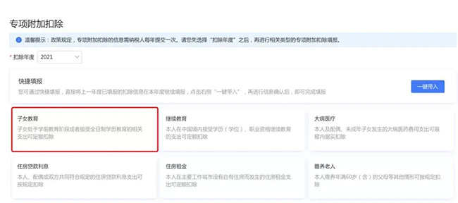 點擊“刪除”后,一鍵確認即可。 情形(四) ?2021年需要新增專項附加扣除項目。 比如2021年新增子女教育扣除,需要申報填寫。 先按情形(1)步驟確認之前申報的其他不需修改的專項附加扣除信息后,選擇扣除年度,點擊相應的扣除項目進行填報。