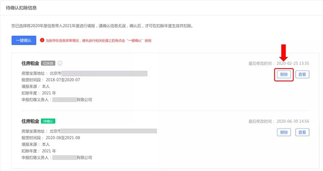 注意:如有“已失效”狀態(tài)的信息,則需先刪除之后才能點擊“一鍵確認”。