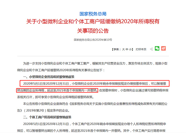 12月31日到期,明年不能享受 需要做稅籌的趕緊看! 增值稅優(yōu)惠 … 1、自2019年2月1日至2020年12月31日,對(duì)企業(yè)集團(tuán)內(nèi)單位(含企業(yè)集團(tuán))之間的資金無償借貸行為,免征增值稅。 如果上述政策到期后,沒有相應(yīng)的延期政策,在12月31日后,企業(yè)集團(tuán)內(nèi)單位之間無償借貸行為,應(yīng)視同銷售,需按貸款服務(wù)繳納增值稅,適用6%的增值稅稅率,且取的專票的不允許抵扣。 2、自2018年9月1日至2020年12月31日,對(duì)金融機(jī)構(gòu)向小型企業(yè)、微型企業(yè)和個(gè)體工商戶發(fā)放小額貸款取得的利息收入,免征增值稅。 3、疫情期間免征增值稅優(yōu)惠政策截止到12月31日。 企業(yè)所得稅優(yōu)惠 … 1、繳2020年所得稅小型微利企業(yè)和個(gè)體工商戶在2020年辦理第三、四季度企業(yè)所得稅預(yù)繳申報(bào)時(shí),可以只申報(bào)不繳稅,應(yīng)繳稅款延緩至2021年1月,同2020年第四季度的稅款一并繳納。 也就是說,符合條件的企業(yè)2020年三、四季度可以不預(yù)扣預(yù)繳所得稅,到2021年再扣。