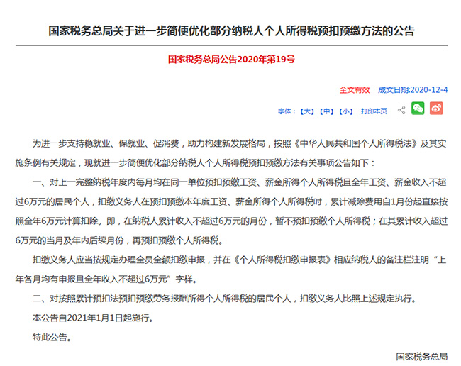 兩類納稅人,自1月起,累計(jì)扣除費(fèi)用直接按照6萬元計(jì)算。 一、上一完整納稅年度各月均在同一單位扣繳申報(bào)了個(gè)稅且全年工資薪金收入不超過6萬元的居民個(gè)人。 需要同時(shí)滿足以下3個(gè)條件:1、上一個(gè)納稅年度1-12月均在同一單位任職且預(yù)扣預(yù)繳申報(bào)了工資薪金所得個(gè)人所得稅。 2、上一納稅年度1-12月累計(jì)的工資薪金收入(包括全年一次性獎(jiǎng)金等各類工資薪金所得,且不扣減任何費(fèi)用及免稅收入)不超過6萬元。 3、本納稅年度自1月起,仍在該單位任職受雇并取得工資薪金所得。 二、按照累計(jì)預(yù)扣法預(yù)扣預(yù)繳勞務(wù)報(bào)酬所得個(gè)人所得稅的居民個(gè)人(如保險(xiǎn)營銷員和證券經(jīng)紀(jì)人)。 需要同時(shí)滿足以下3個(gè)條件:1、上一納稅年度1-12月均在同一單位取得報(bào)酬且按照累計(jì)預(yù)扣法預(yù)扣預(yù)繳申報(bào)了勞務(wù)報(bào)酬所得個(gè)人所得稅。 2、上一納稅年度1-12月的累計(jì)勞務(wù)報(bào)酬(不扣減任何費(fèi)用及免稅收入)不超過6萬元。 3、本納稅年度自1月起,仍在該單位取得按照累計(jì)預(yù)扣法預(yù)扣預(yù)繳稅款的勞務(wù)報(bào)酬所得。 預(yù)扣預(yù)繳方法 … 在納稅人累計(jì)收入不超過6萬元的月份,暫不預(yù)扣預(yù)繳個(gè)稅; 在其累計(jì)收入超過6萬元的當(dāng)月及年內(nèi)后續(xù)月份,再預(yù)扣預(yù)繳個(gè)稅。 舉個(gè)簡(jiǎn)單例子:張三1月份取得收入1萬元,不考慮其他費(fèi)用,則需要繳納個(gè)稅=(10000-5000)×3%=150元。 如果符合上述條件,由于張三月工資沒有超過可以直接累計(jì)扣除的6萬元,就不用預(yù)繳個(gè)稅。 實(shí)施時(shí)間 … 自2021年1月1日起施行。