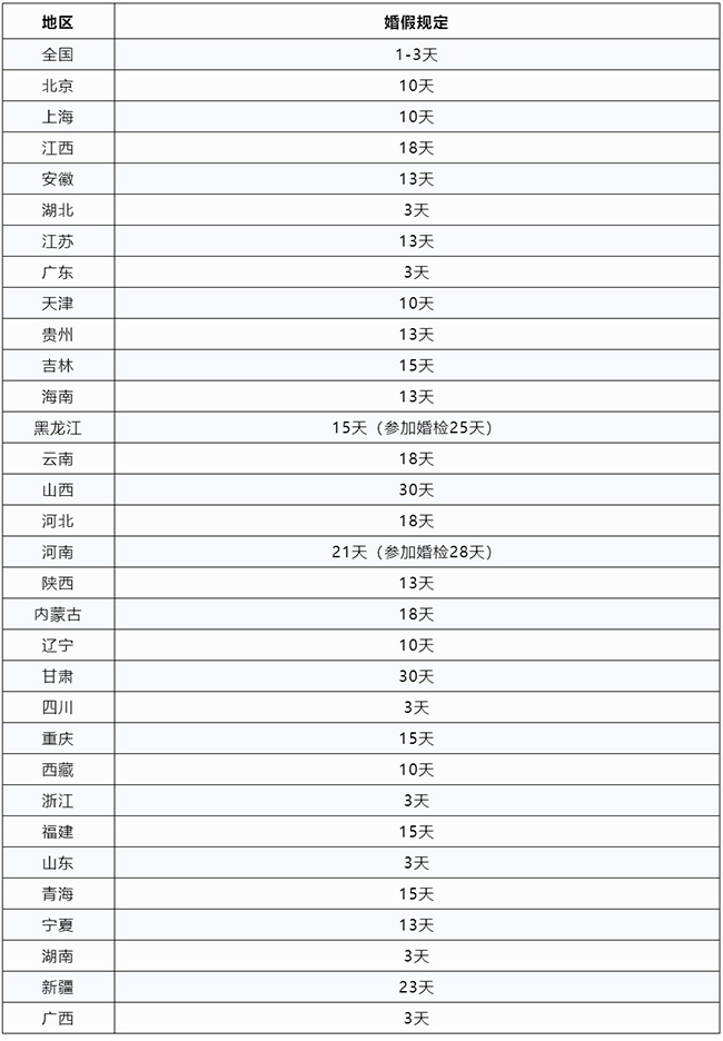 2、國(guó)家層面上關(guān)于婚假的規(guī)定 根據(jù)勞動(dòng)法第四章第五十一條規(guī)定: 勞動(dòng)者在法定休假日和婚喪假期間以及依法參加社會(huì)活動(dòng)期間,用人單位應(yīng)當(dāng)依法支付工資。 另外,根據(jù)《計(jì)劃生育條例》的規(guī)定:   1.按法定結(jié)婚年齡(女20周歲,男22周歲)結(jié)婚的可享受3天婚假。   2.符合晚婚年齡(女23周歲,男25周歲)的將不再享受晚婚假獎(jiǎng)勵(lì)也只有3天法定婚假。   3.結(jié)婚時(shí)男女雙方不在同一地方工作的,可視路程遠(yuǎn)近給予路程假。   4.在探親假期間結(jié)婚的不另給假期。   5.婚假包括公休假和法定假。   6.再婚者與初婚者一樣可享受法定婚假。   關(guān)于婚假工資計(jì)算方式   在婚假的問(wèn)題上,雖然國(guó)家對(duì)職工的休息、休假有規(guī)定,但并未明確規(guī)定工資計(jì)發(fā)的標(biāo)準(zhǔn)。 《關(guān)于國(guó)營(yíng)企業(yè)職工請(qǐng)婚喪假和路程假問(wèn)題的通知》規(guī)定:職工本人結(jié)婚可以根據(jù)具體情況,由本單位行政領(lǐng)導(dǎo)批準(zhǔn),酌情給予一至三天的婚喪假。 假期在三個(gè)工作日以?xún)?nèi)的,工資照發(fā)。在批準(zhǔn)的婚喪假和路程假期間職工的工資照發(fā)。途中的車(chē)船費(fèi)等,全部由職工自理。 因此在婚假的工資發(fā)放標(biāo)準(zhǔn)上,目前還沒(méi)有適用于全國(guó)的統(tǒng)一規(guī)定。 婚假是否有有效期? 1、我國(guó)法律并沒(méi)有對(duì)婚假的有效期做出明確的規(guī)定。一般來(lái)說(shuō),不同的公司會(huì)有不同的規(guī)章制度來(lái)約定婚假的有效期。 2、對(duì)于公司來(lái)說(shuō),一般規(guī)定員工一年或是半年之內(nèi)必須休完婚假,否則視為自動(dòng)放棄該福利。 3、婚假必須一次性休完,不可單獨(dú)分開(kāi)使用。 3、2023最新版全國(guó)婚假一覽表