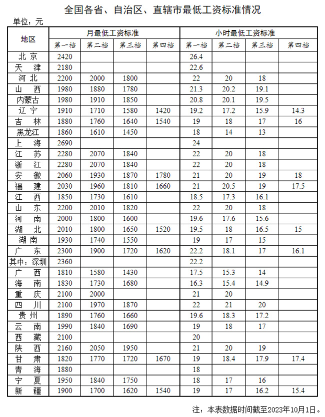 | 2023年馬上就要結(jié)束了,企業(yè)又到一年一度的調(diào)薪時(shí)間,那你的工資有沒有漲呢? 近期,多地人社官方發(fā)布2023年企業(yè)工資指導(dǎo)線以及最新工資標(biāo)準(zhǔn),官方喊話到手工資要漲了! 人社官方發(fā)布最低工資標(biāo)準(zhǔn) 2023年11月起,強(qiáng)制執(zhí)行 看完上述的文章,肯定有小伙伴吐槽:既然企業(yè)工資指導(dǎo)線只作為參考數(shù)據(jù),不是強(qiáng)制執(zhí)行,那也沒什么意義? 那你可要注意了! 近期,人社部也發(fā)布了最低工資標(biāo)準(zhǔn),是強(qiáng)制執(zhí)行的,月薪低于這個(gè)數(shù),就是違法!