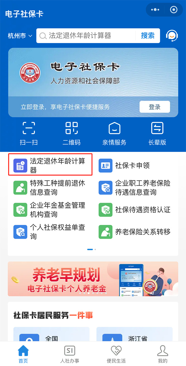 2、本人對應(yīng)的法定退休年齡查詢 參保人員查詢本人法定退休年齡,可以通過4個(gè)人力資源和社會保障部的官方線上服務(wù)渠道查詢: (1)國家社會保險(xiǎn)公共服務(wù)平臺; (2)全國人社政務(wù)服務(wù)平臺; (3)電子社保卡; (4)“掌上12333”APP。 通過上述途徑訪問“退休年齡計(jì)算器”,輸入本人的出生日期、性別等信息,即可查詢對應(yīng)的法定退休年齡和退休年月。