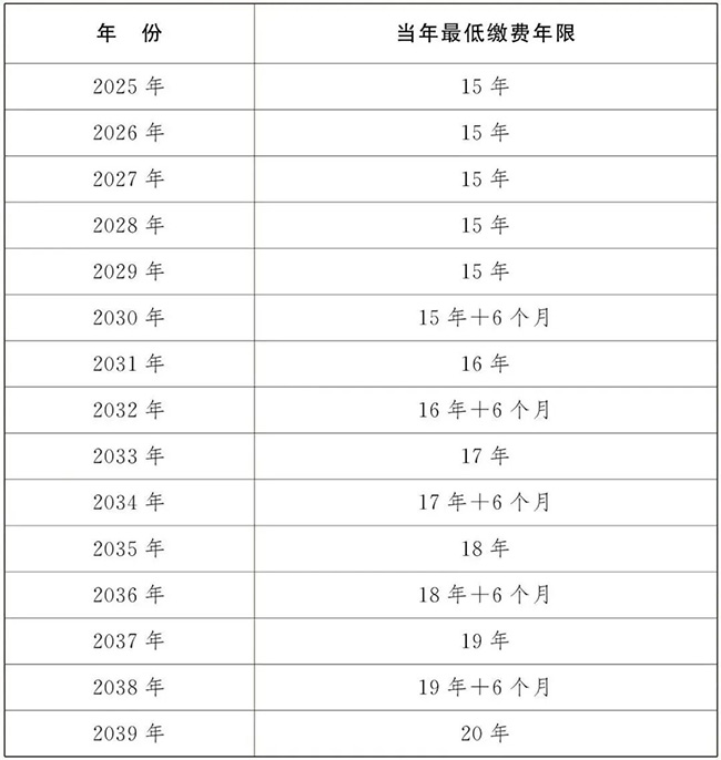 此外,參保人員還可以通過撥打12333咨詢服務(wù)熱線、前往社會保險(xiǎn)經(jīng)辦機(jī)構(gòu)服務(wù)窗口等線下方式,查詢本人法定退休年齡。 3、關(guān)于最低繳費(fèi)年限 2029年12月31日前,職工按月領(lǐng)取基本養(yǎng)老金最低繳費(fèi)年限仍為15年。 從2030年1月1日起,按照每年提高6個(gè)月的節(jié)奏,將職工按月領(lǐng)取基本養(yǎng)老金最低繳費(fèi)年限由15年逐步提高至20年。 提高最低繳費(fèi)年限情況表: